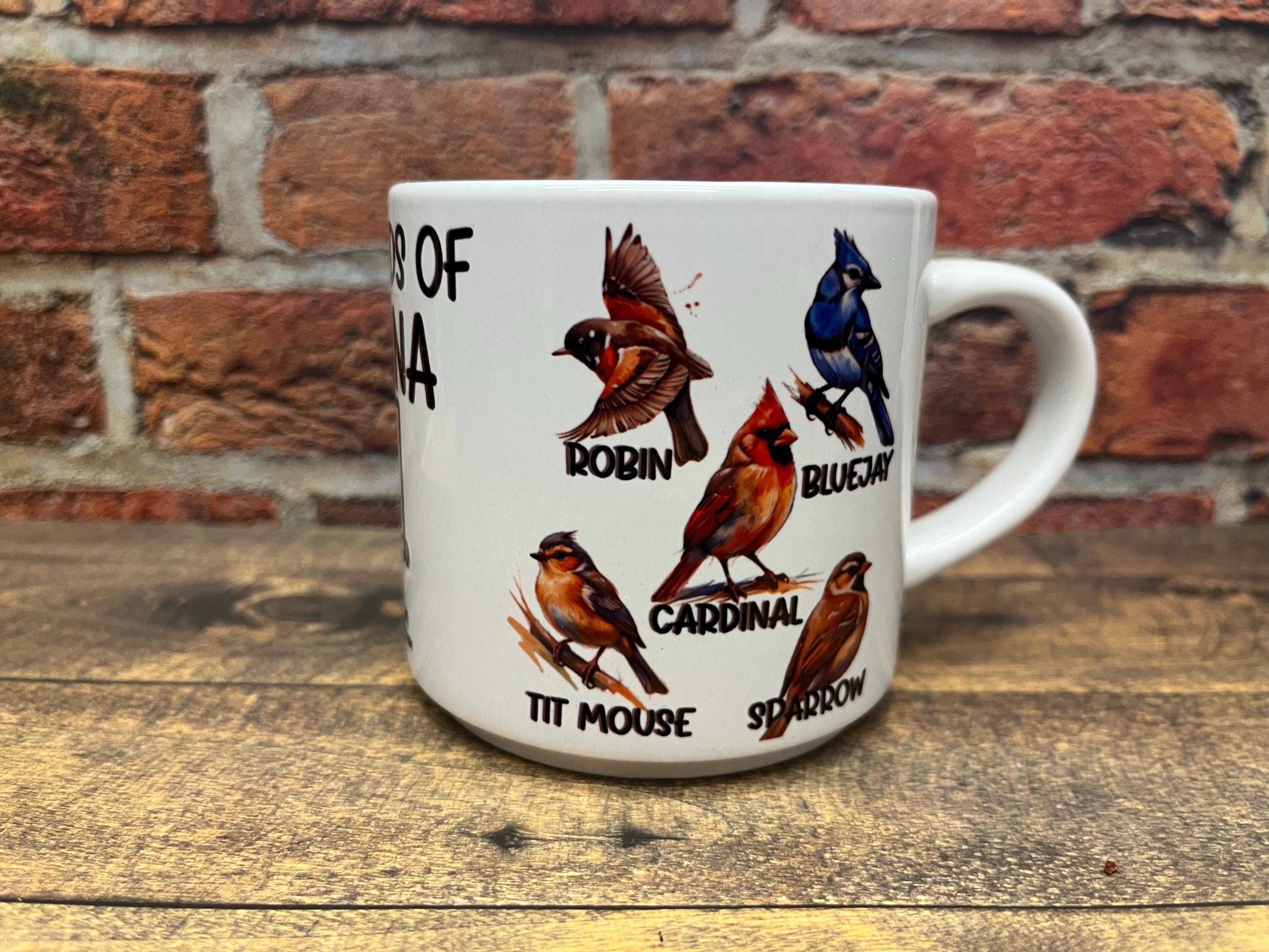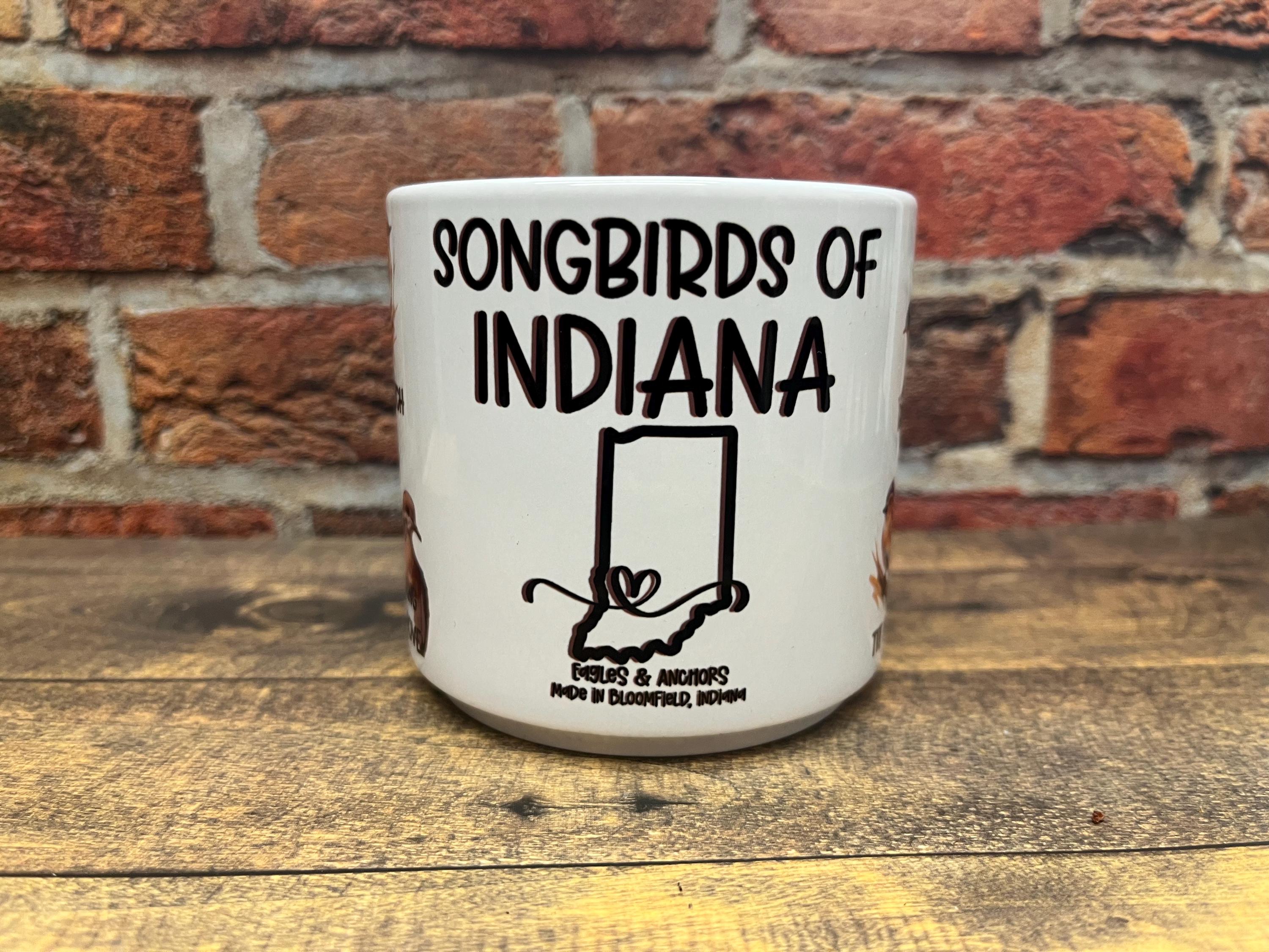 Beautiful Display of Songbirds Native to Indiana, the heart is overlapping Bloomfield Indiana where this treasure was made specially for you. These artistically colored birds are laid out 5 species on each side for a total of 10 uniquely artistically colored birds around the Ceramic mug. 10 Ounce Mugs are all white, our 12 and 15 options feature black accents on the handle and the inside of the mug.