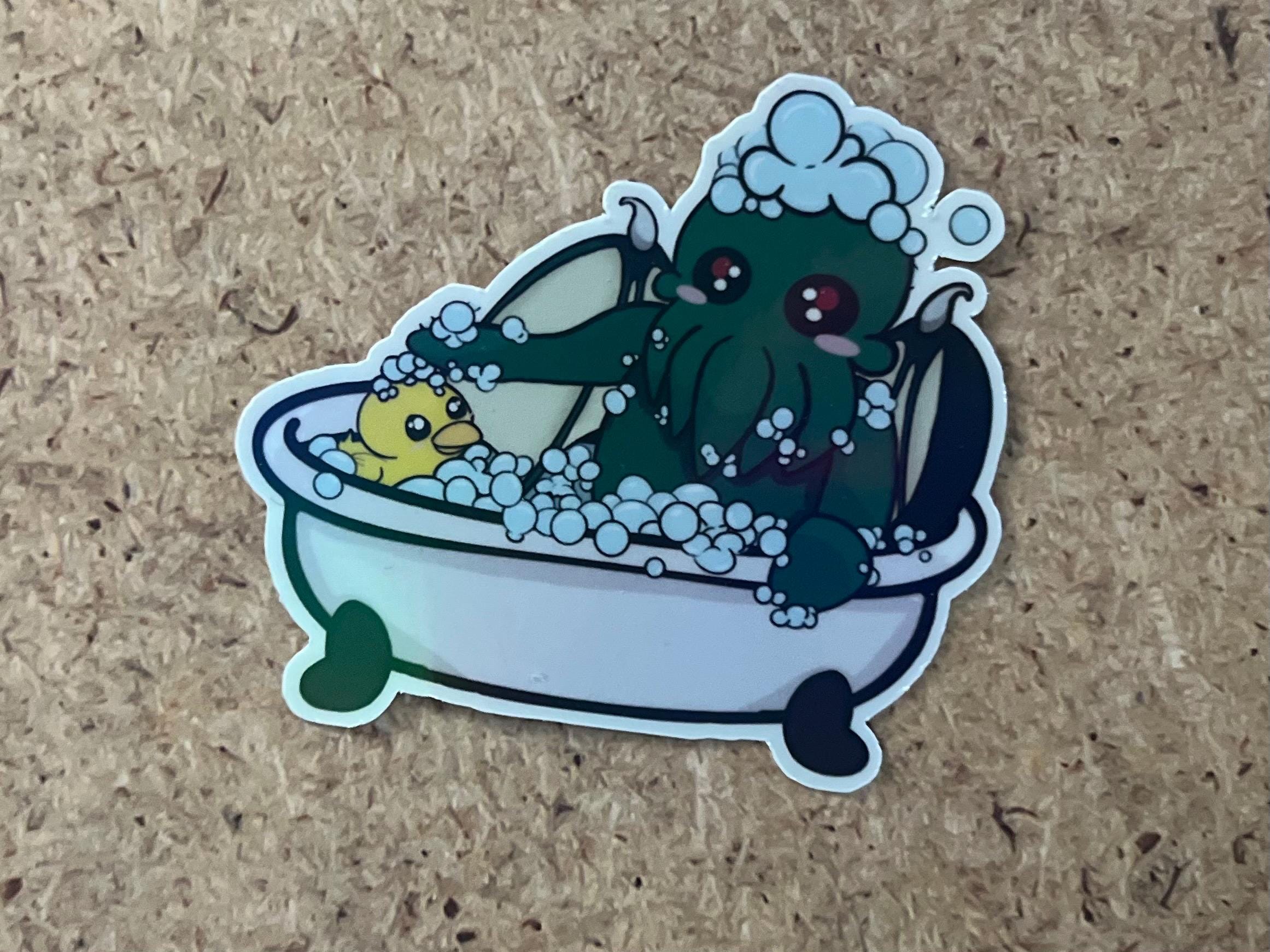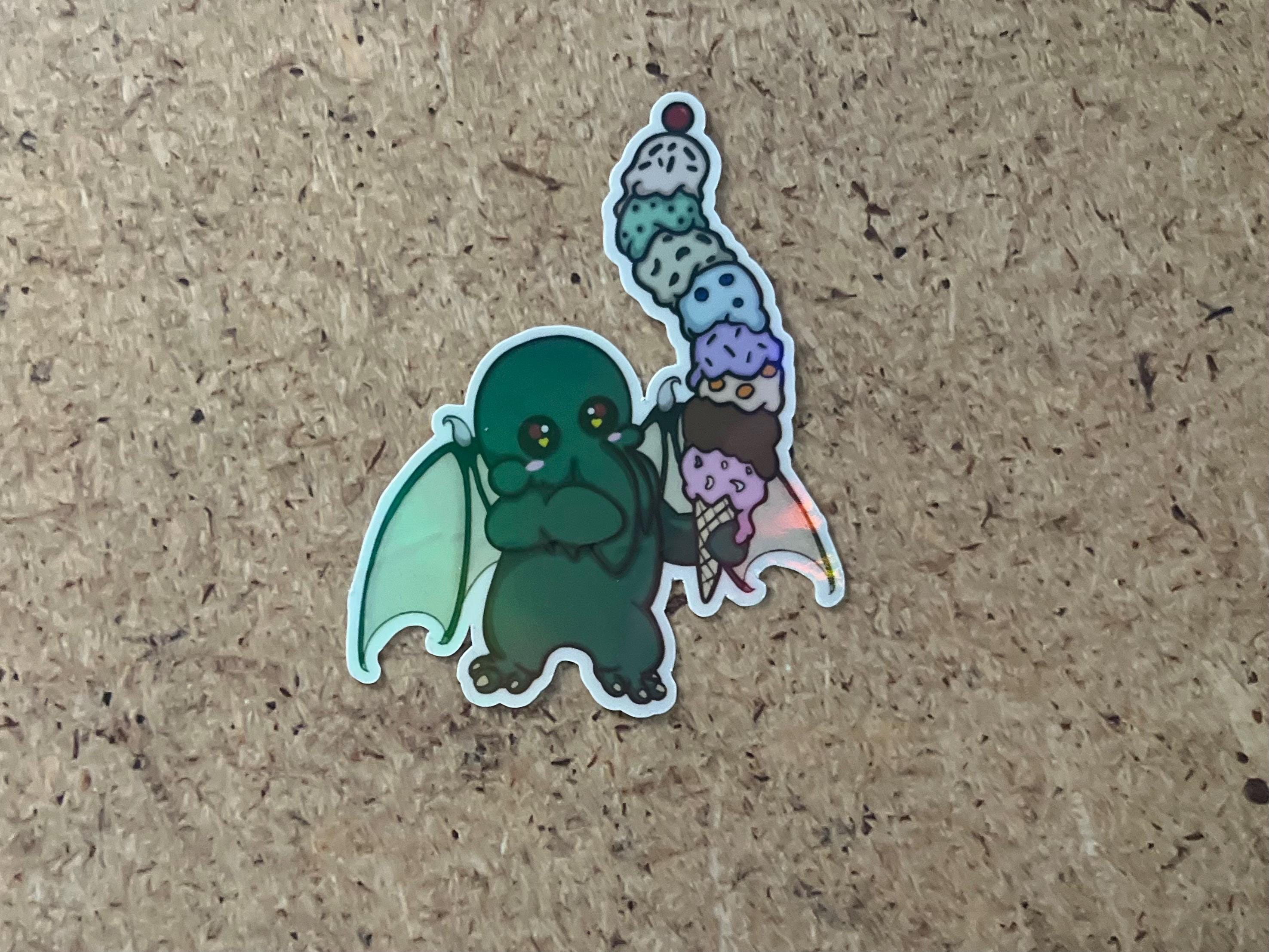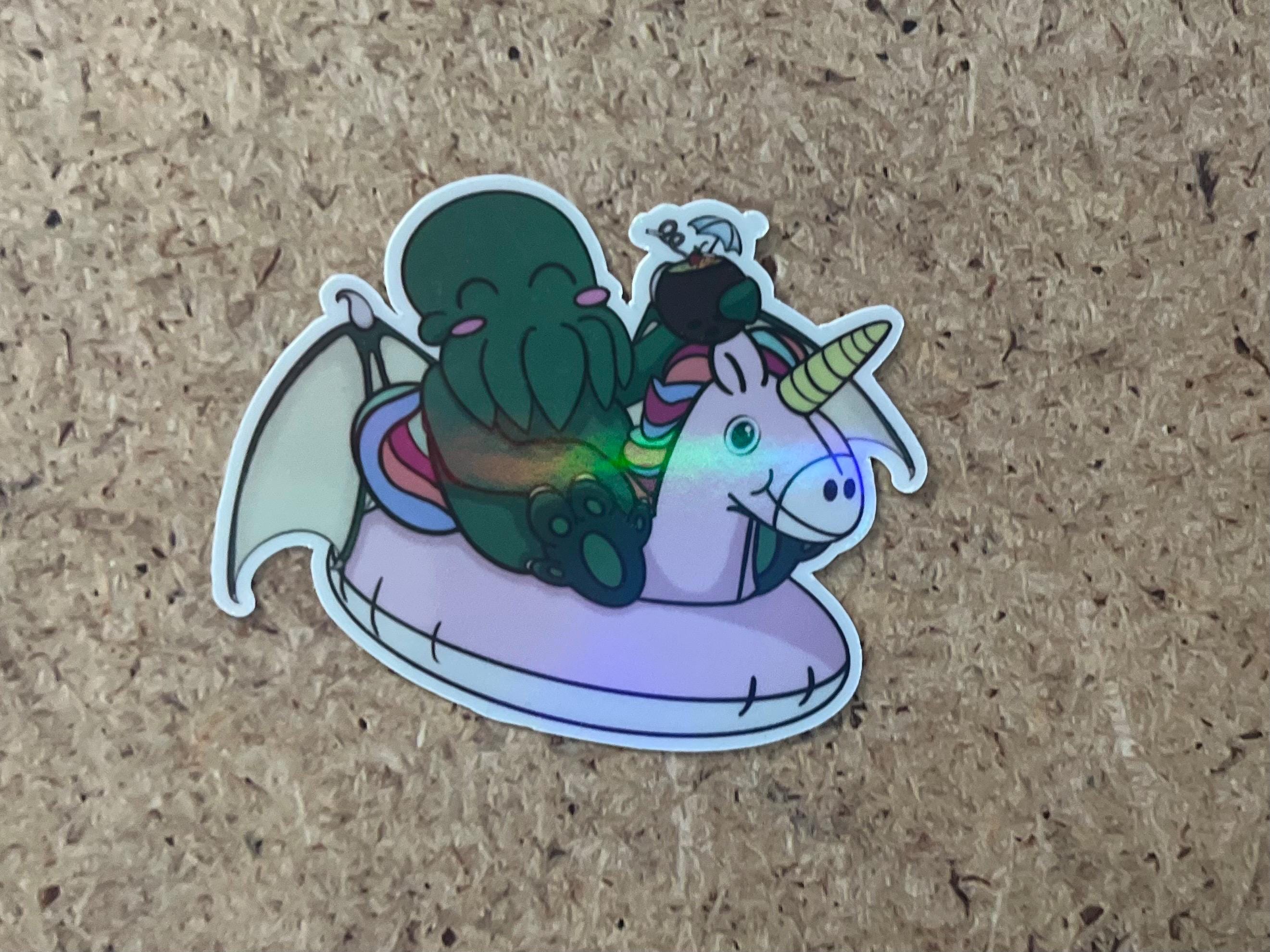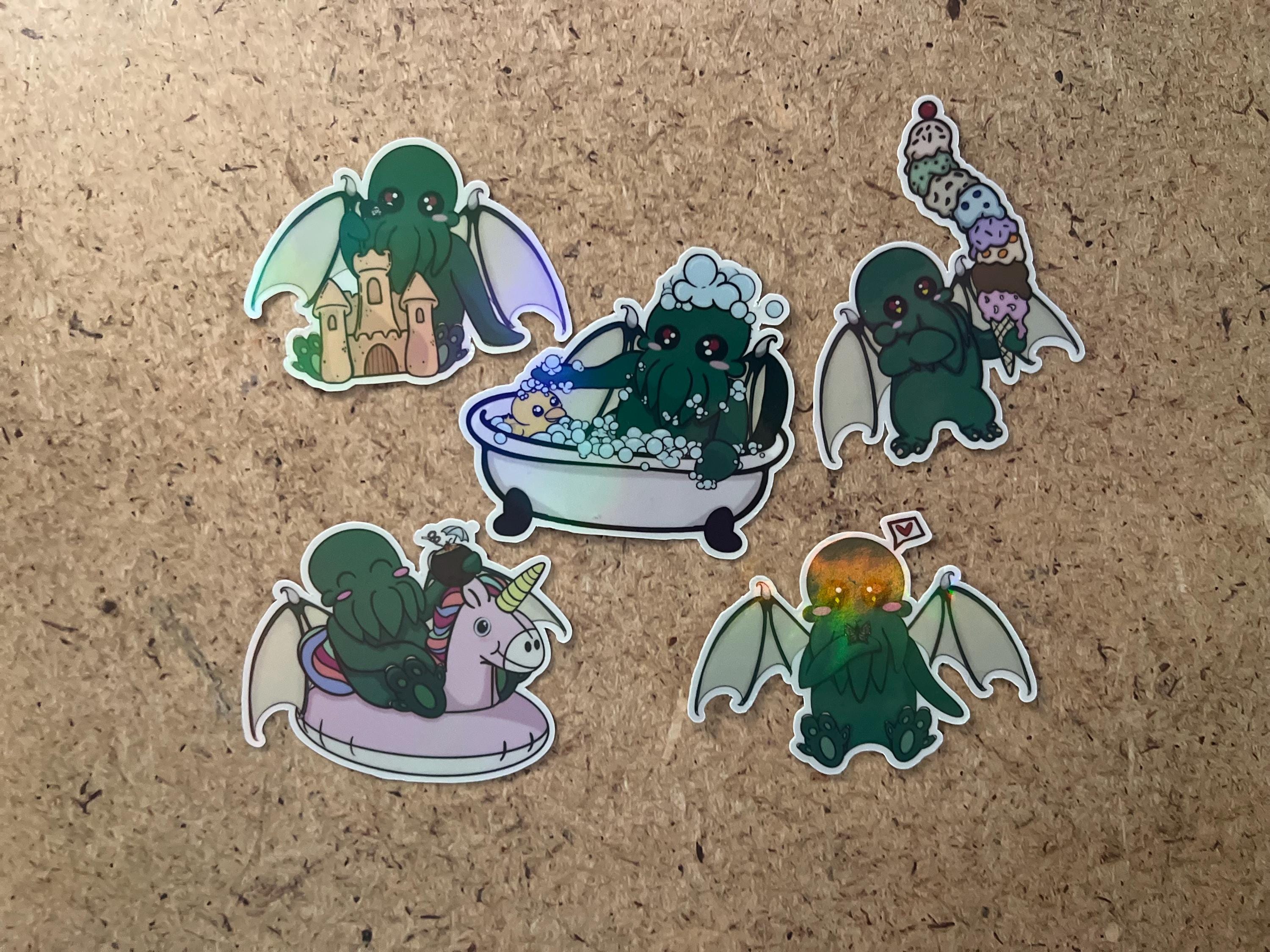 This delightful collection features 5 Rainbow Holographic UV-resistant and waterproof decals, each measuring approximately 2.5 inches or more, perfect for personalizing your belongings. Enjoy whimsical designs like "Fun in the Sand," showcasing a charming sandcastle, "R&R" with Cthulhu floating on a unicorn, "Enamored Butterfly" capturing a love icon admiring a purple butterfly, "Perfection" featuring a towering stack of ice cream scoops, and "Cthulhu and his Rubby Ducky" splashing in a bubbly tub. Elevate your style and express your personality with these fun, HUGE and vibrant decals!